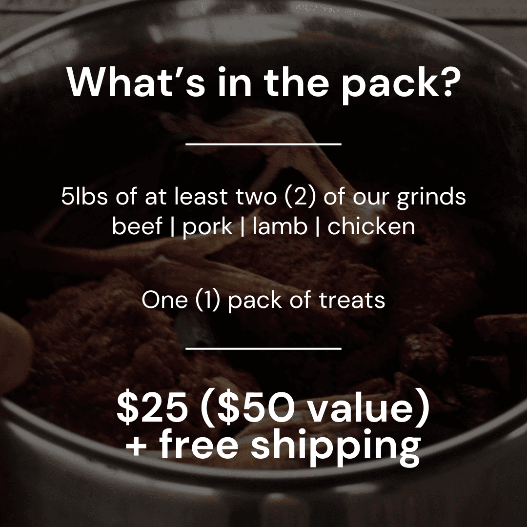 Our Starter Pack is designed to make raw feeding simple, balanced, and rewarding. Each bundle includes a five pound mixed supply of our in-house 80/10/10 raw grind—made from human-grade meat, bone, and organs—and a curated selection of freeze-dried treats made from beef, pork, lamb, and/or chicken.